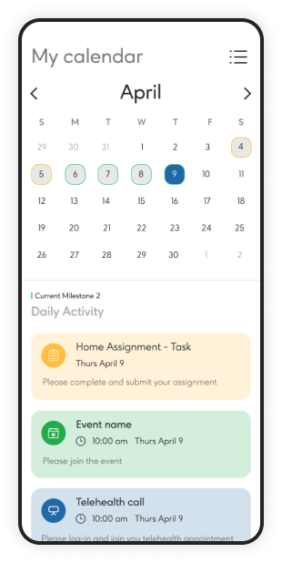 Patients can check the calendar in their app to learn about upcoming tasks and other details.