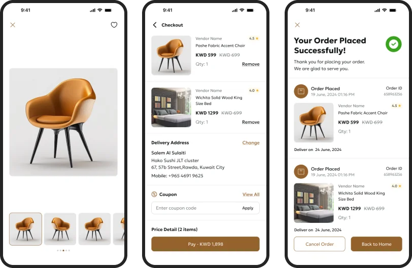 A multi-vendor furniture delivery platform with web and mobile apps connecting customers, vendors, and admins through one unified system.